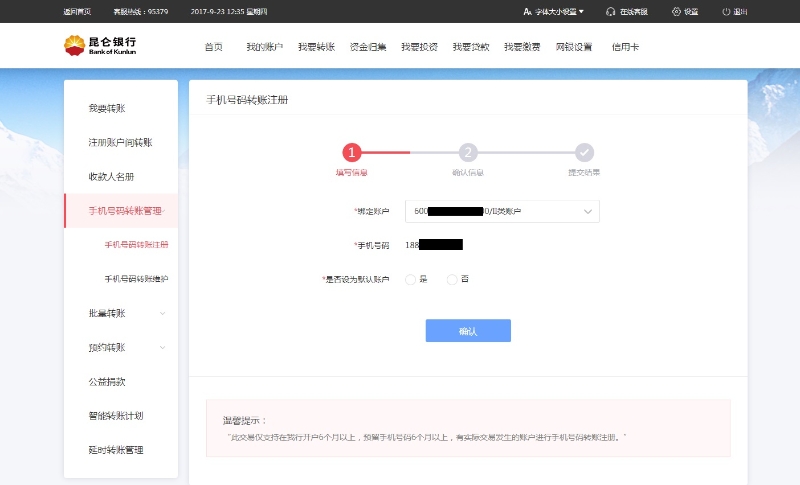 一、什么是“手机号码支付” “手机号码支付”是人民银行为支持移动支付业务发展,依托网上支付跨行清算系统(“超级网银”)开展的一项新业务。用户开通“手机号码支付”业务需要通过开户银行将手机号码与常用银行账号进行绑定注册,实现在不输入账号的情况下,通过输入手机号码自动关联银行账号完成跨行支付转账。支持转账、收费、缴费、红包等多种场景。 二、“手机号码支付”特点 ●便捷 "手机号码支付”业务是基于银行账号的收付款业务,客户仅需输入对方的手机号码,即可自动关联银行账号完成支付,账号、户名、开户行等繁琐信息均可免于输入。同时,手机号码本身也方便获得、记录和传递。 ●直达 手机号码支付,资金实时计入银行账户,无需提现和支付提现费。 ●灵活 只要商业银行正常营业,用户即可在任何时间、任何地点实现随时操作、即时转账。单笔可达5万元,灵活支持转账、收费、缴费、红包等多种场景的额度需求。支付双方不需要在同一家银行开户,轻松支持跨行支付。 ●可靠 手机号码支付作为央行支付旗下品牌,由央行与商业银行联合为社会公众提供支付清算服务,是更加安全可靠的支付方式。 三、“手机号码支付”适用范围 我行手机银行和个人网银均可操作~ 个人网银操作步骤: (1)登录个人网银,点击“我要转账”——>“手机号码转账管理”——>“手机号码转账注册”进入信息录入页面: